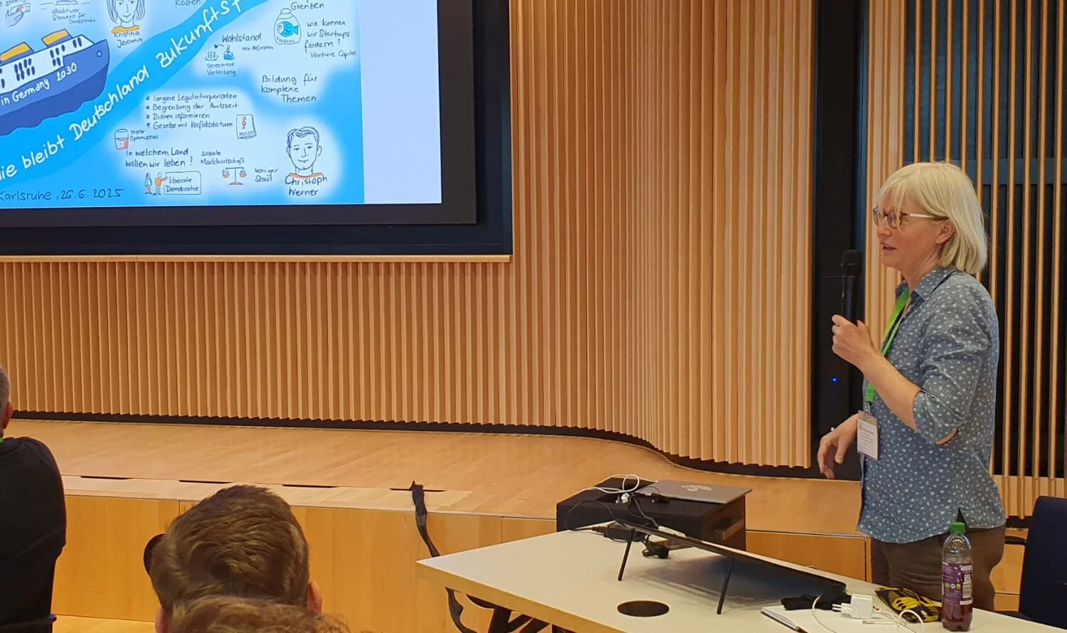 Bei einer Konferenz mit 150 Personen oder mehr kommt ein Papierbild an seine Grenzen – kaum jemand in der hinteren Reihe kann es sehen. Das digitale Graphic Recording löst dieses Problem: Das Bild entsteht live auf einem Tablet und wird gleichzeitig oder am Ende der Veranstaltung auf Leinwände, Bildschirme oder in den Livestream übertragen. Auch wenn Ihr Event mehrere Räume oder Locations hat, ist die digitale Variante die flexiblere Wahl. Ich habe auch schon eine Veranstaltung im Freien begleitet – es begann zu regnen. Hier konnte ich mit meinem iPad sehr schnell an einen überdachten Platz ausweichen.